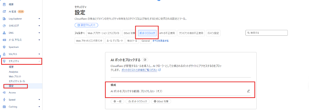 以下の手順で、Cloudflare上のAIクローラー制御を確認・変更できます。