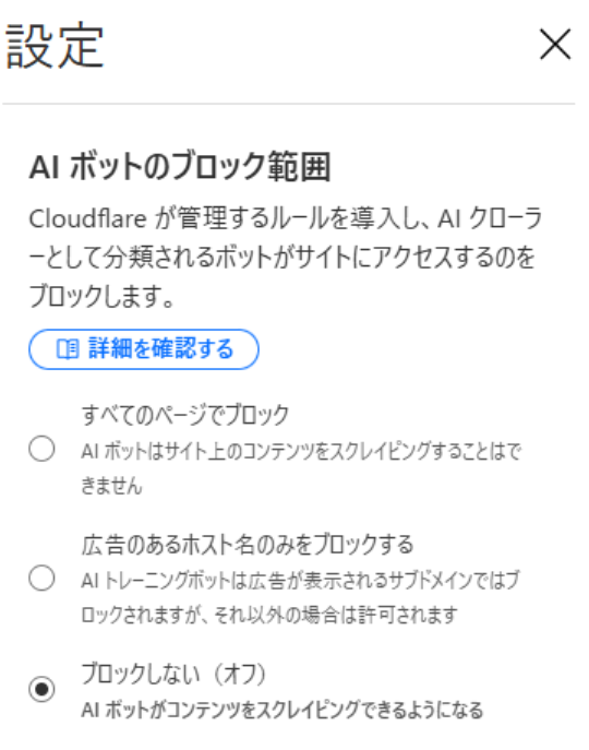 3. 「AI ボットをブロックする」という項目で、以下の選択肢から選択