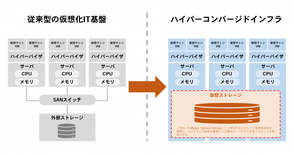 従来型の仮想基盤とハイパーコンバージドインフラの比較