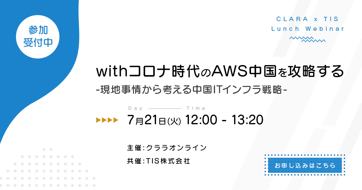 2020年7月21日(火)に、クララ株式会社主催、TIS株式会社共催、アマゾン ウェブ サービス ジャパン株式会社協力でAWS中国攻略ウェビナーを開催しました。当ウェビナーでは、コロナ禍においての中国でのクラウド、主にAWS中国リージョンの活用についてお届けしました。