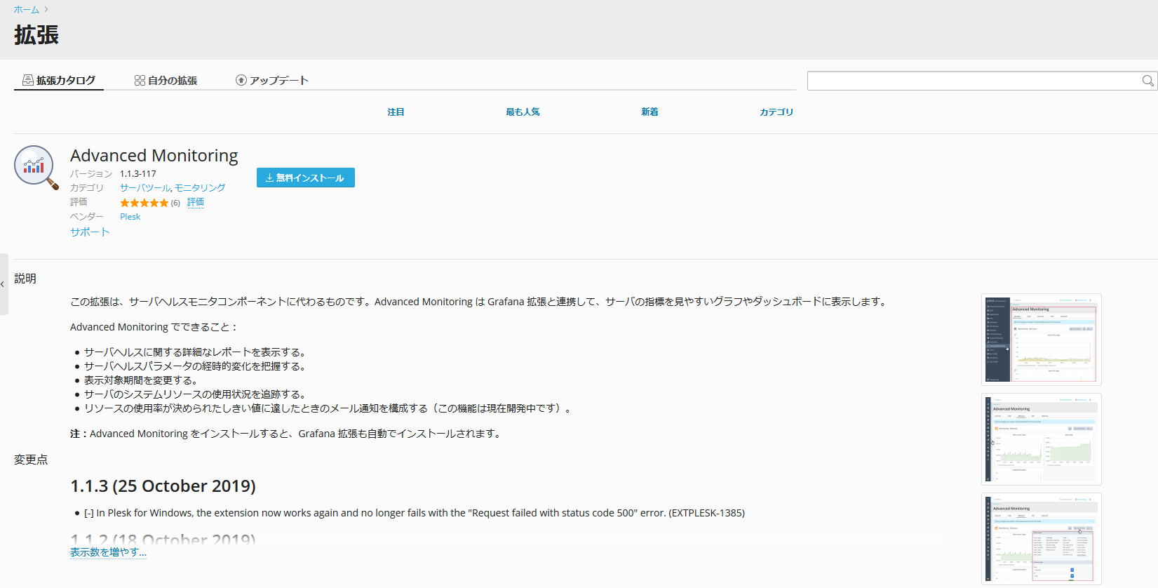 Plesk Extensions(プレスク クステンション)同様に、「無料インストール」ボタンから簡単にインストールすることができます。