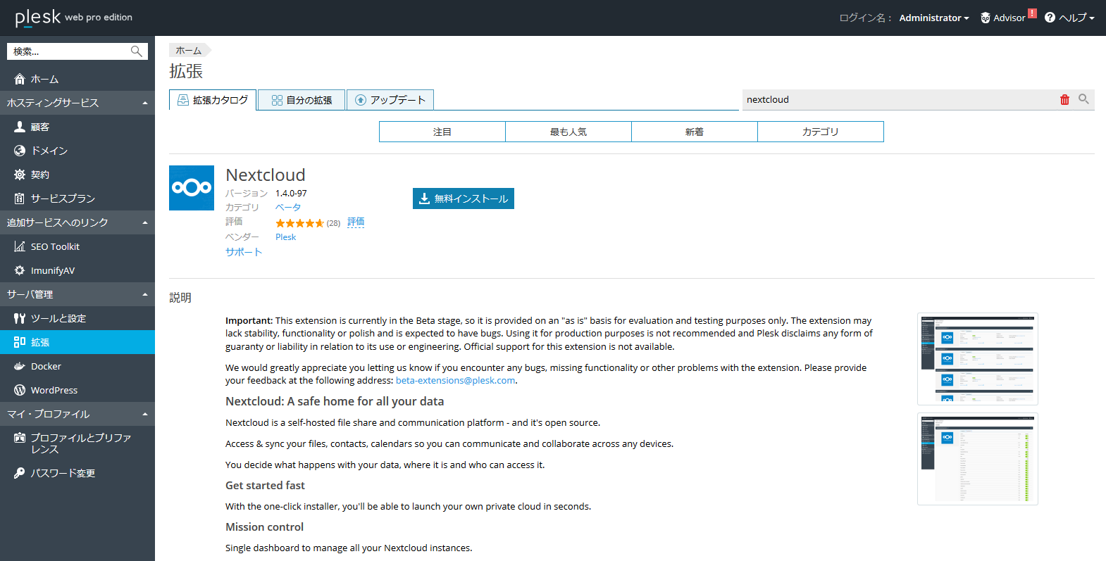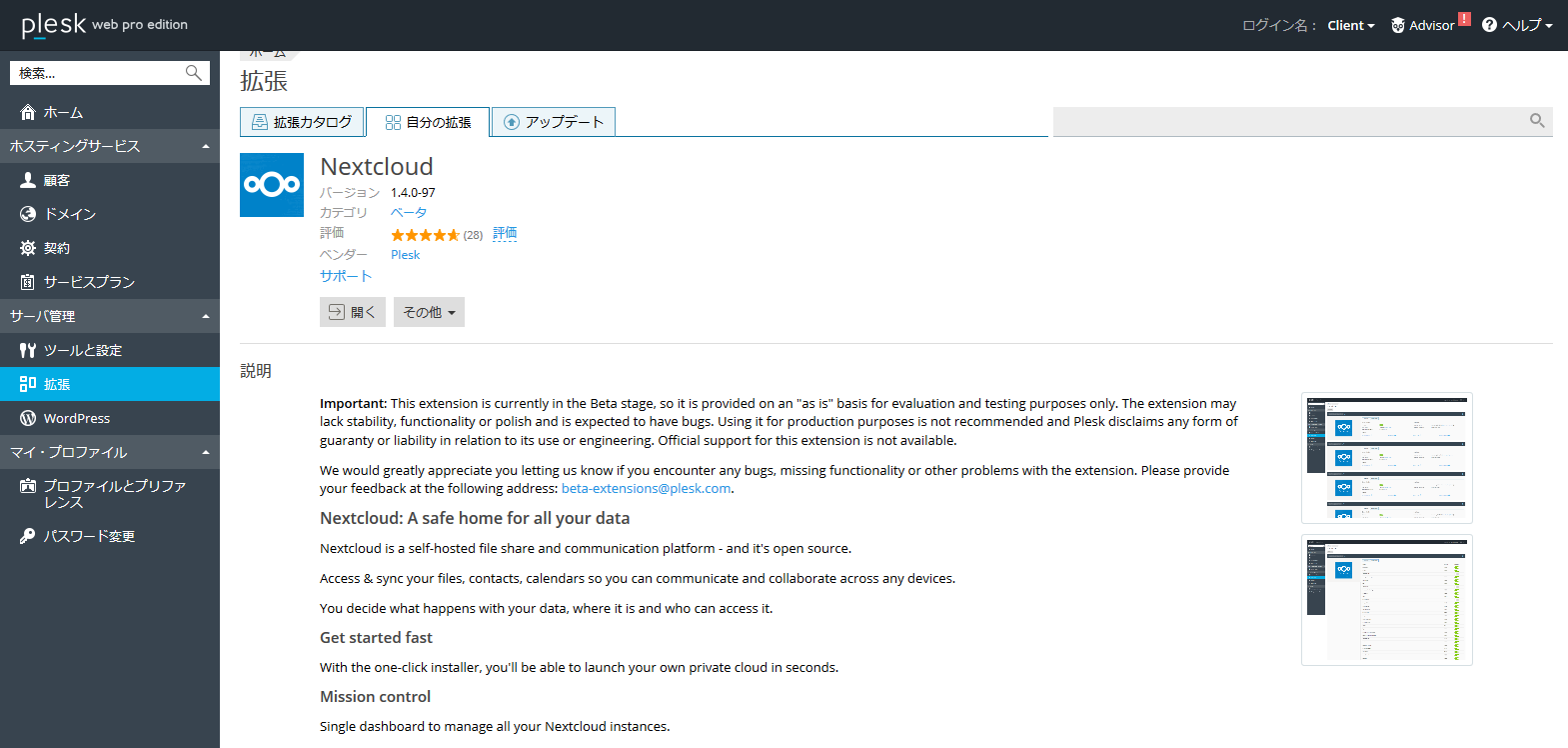 この Nextcloud が、Plesk Extensions(プレスク エクステンション)に入っています。