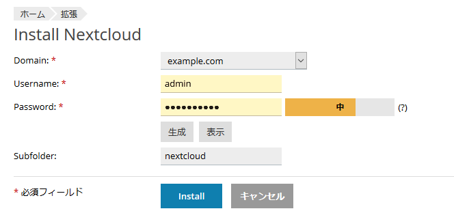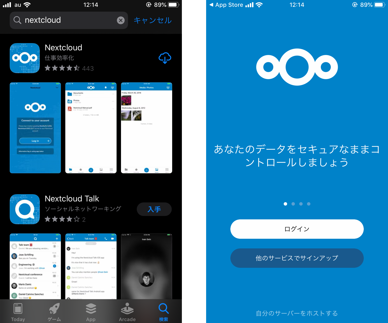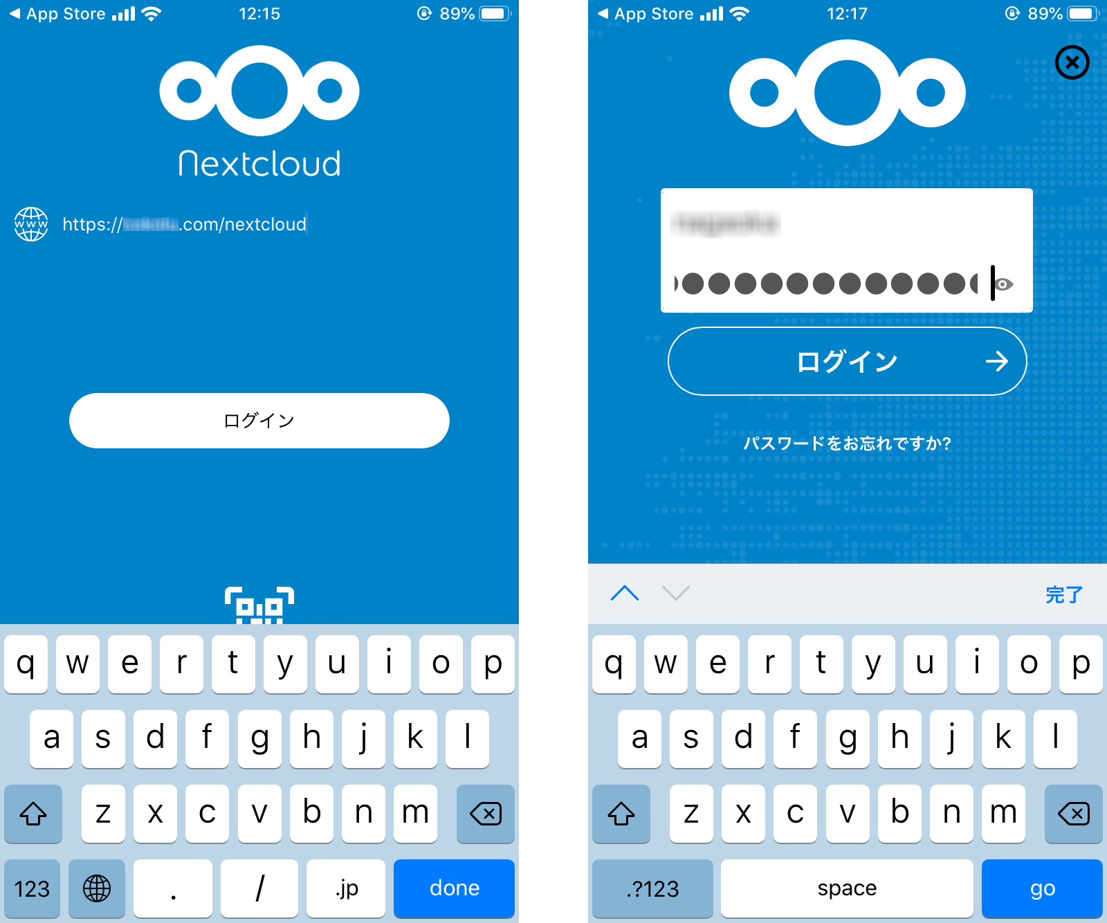 ログインをクリックし、URL(ドメイン名/nextcloud)とログイン情報を入力します。