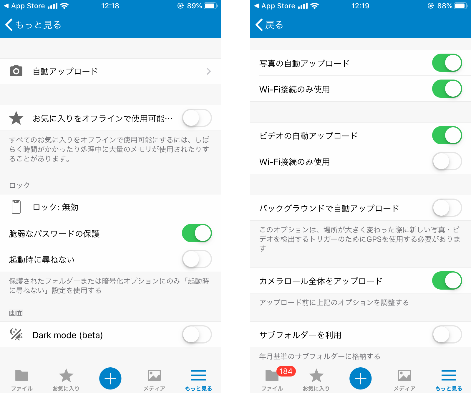 設定画面から、「自動アップロード」の「写真の自動アップロード」を ON にしておくと、スマートフォンに保存されている写真データがすべて自動的にバックアップされます。